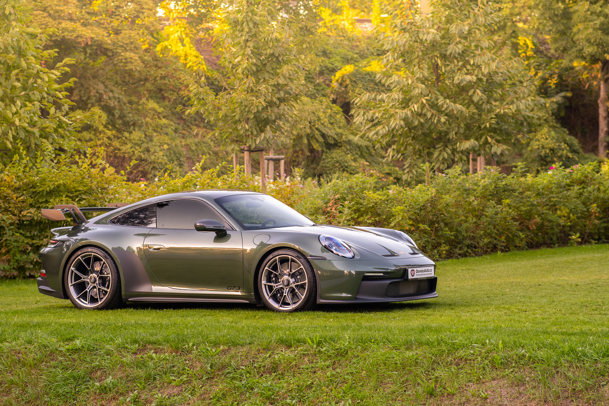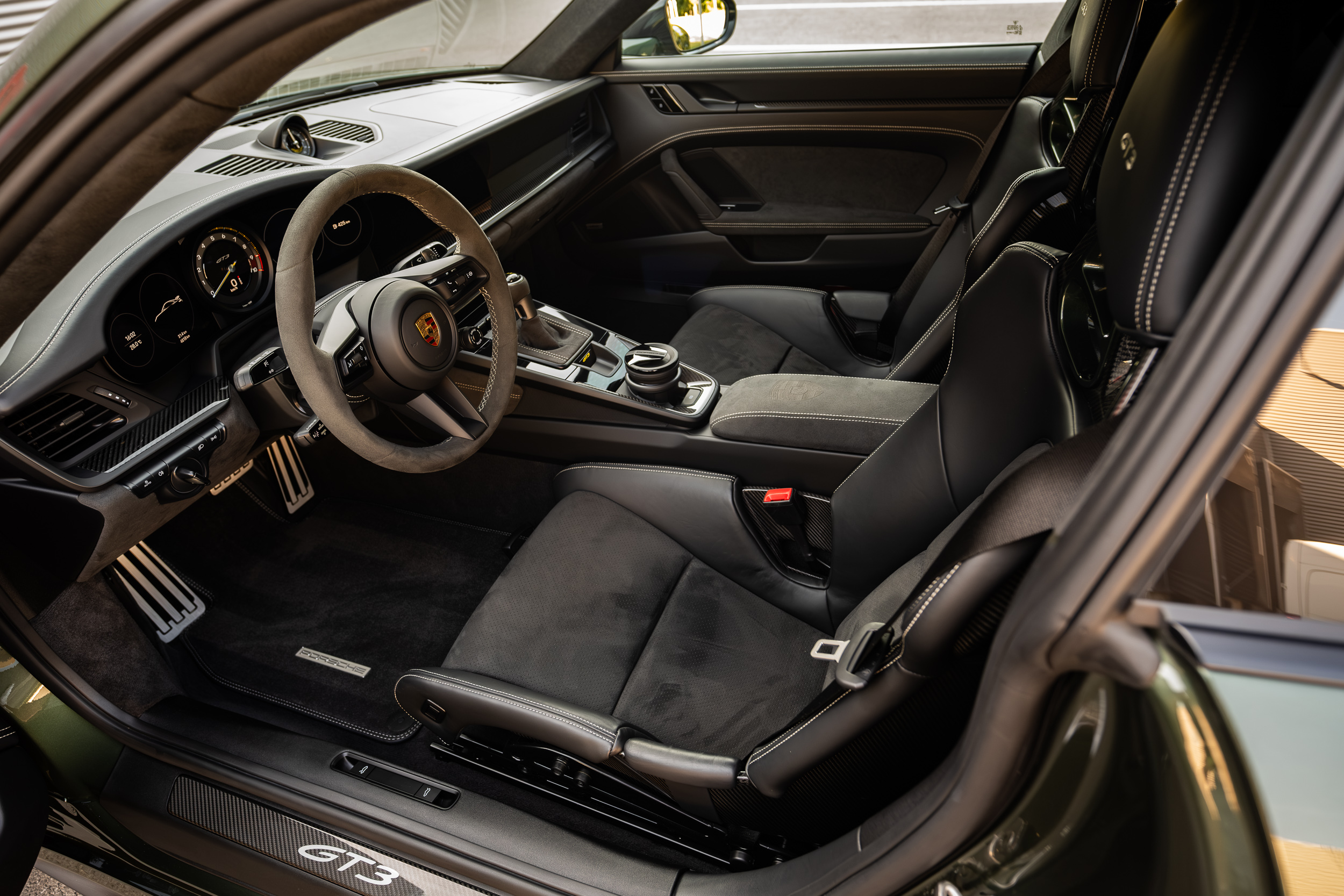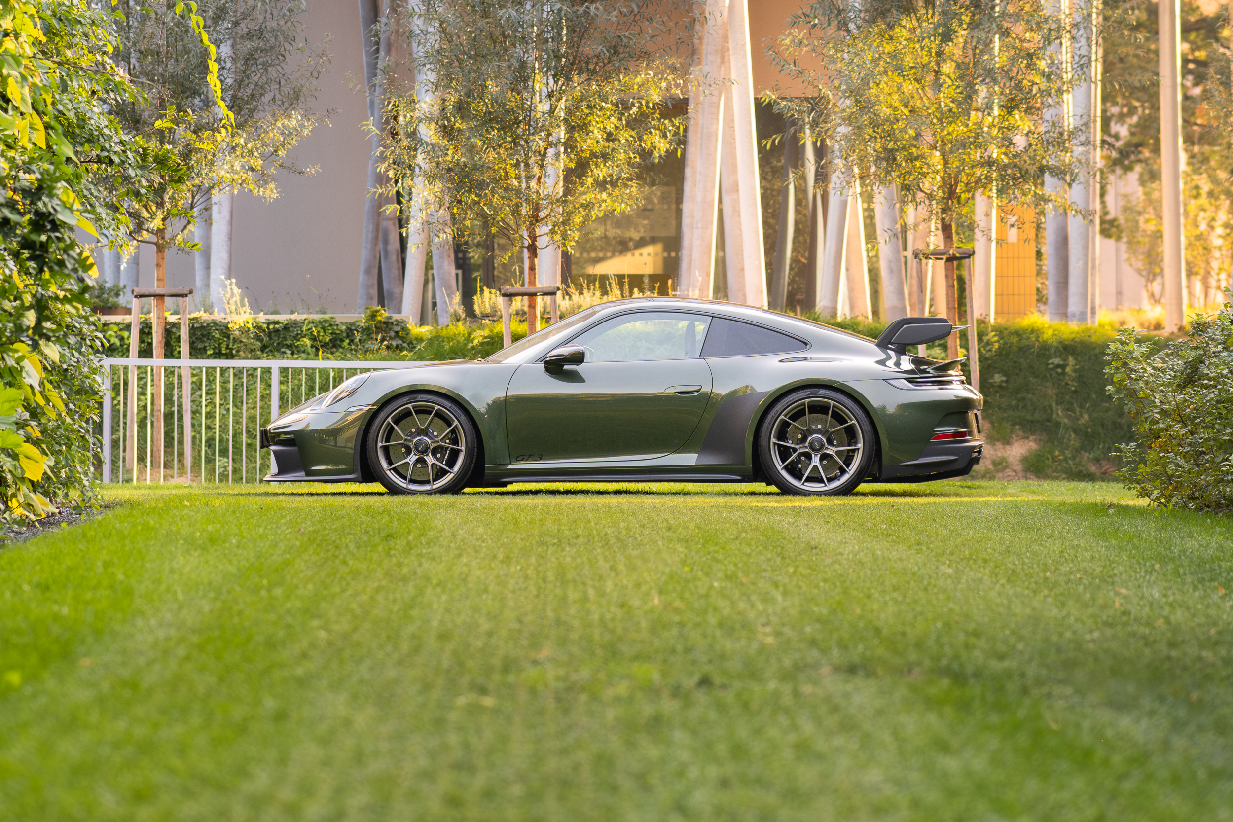 The 911 992 GT3 model in the color version with the traditional exclusive Oak Green metallic from 1976 blends two worlds, the world of dynamics and the world of elegance.